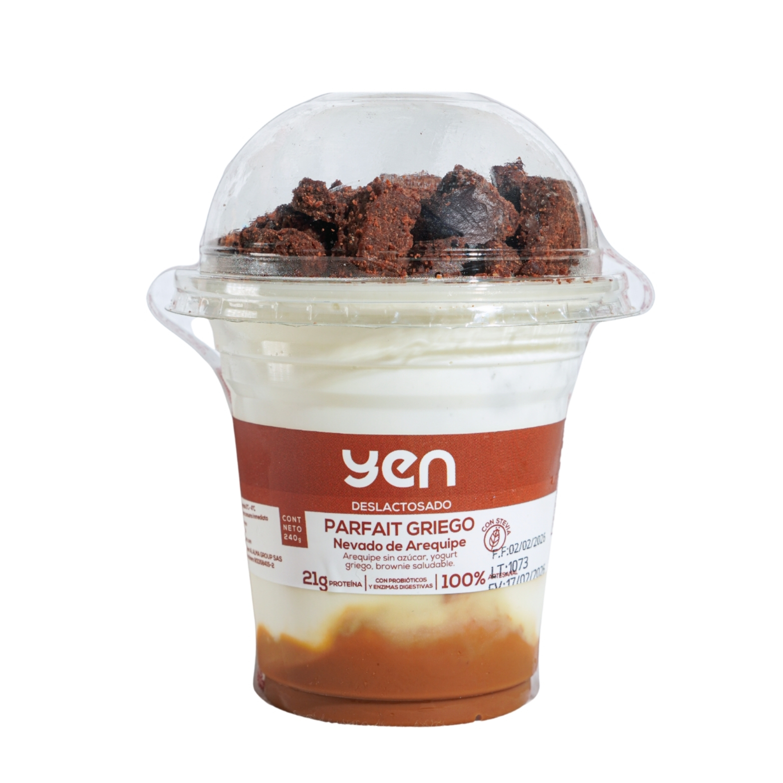 Empieza con una base cremosa y brillante de arequipe sin azúcar, sigue con nuestro yogurt griego deslactosado —espesito, fresco— y termina con cubos de brownie saludable que hacen todo el contraste perfecto. Un postre alto en proteína, artesanal y tan rico que se siente como el regalo anticipado que todos esperan en diciembre.